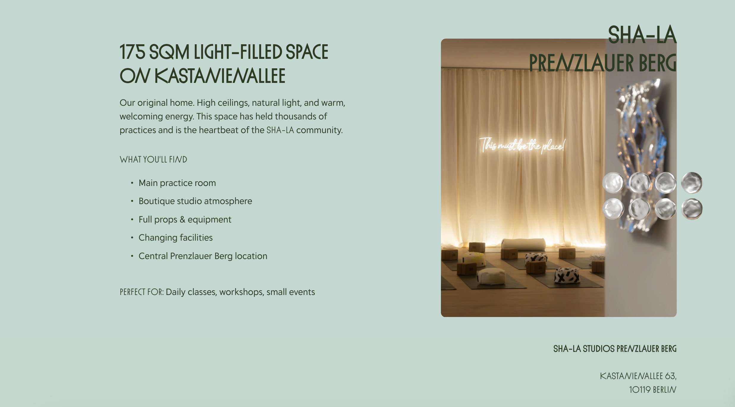 SHA-LA Studios Berlin is the leading hub for yoga practice, community and continuing yoga education in Berlin. For the opening of their new 300m2 waterfront location by the Spree, I redesigned relevant parts of their website and created graphic assets.